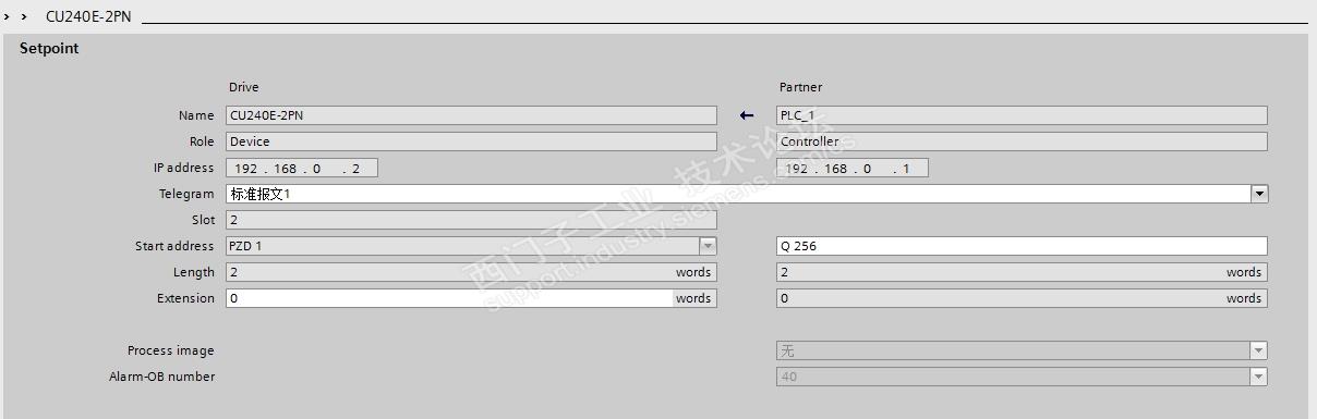 2、对控制模块进行设置,这里主要有几个地方,一个是设备名称,一个是IP地址,还有一个是报文类型。设备名称和IP地址我确认过了,并且通过博图软件中的“在线访问”已经和变频器中进行了同步,变频器也没有任何的报警和故障。