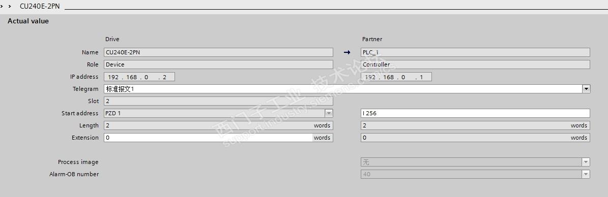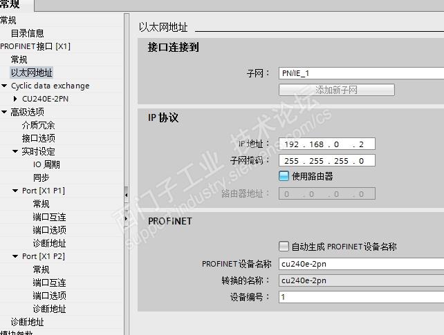 2、对控制模块进行设置,这里主要有几个地方,一个是设备名称,一个是IP地址,还有一个是报文类型。设备名称和IP地址我确认过了,并且通过博图软件中的“在线访问”已经和变频器中进行了同步,变频器也没有任何的报警和故障。