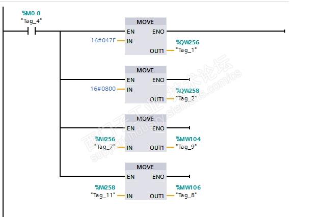 4、主程序我也没有加别的功能,就是M0.0开启后,直接将16进制的控制字047F和转速设定值0800赋值给QW256和QW258,状态字IW256和实际转速值IW258赋值给内部变量。