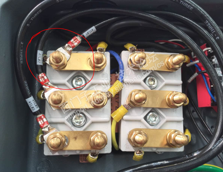 现在的问题是启动电机直接烧驱动器内部保险,严重怀疑是短路造成的,检查电机内部接线,发现如图所示。用万用表量不出来短路,现场有说用高阻表可以量出来那两根线是短路的。感到疑惑,现场没有高阻表。所以先在论坛确定下。