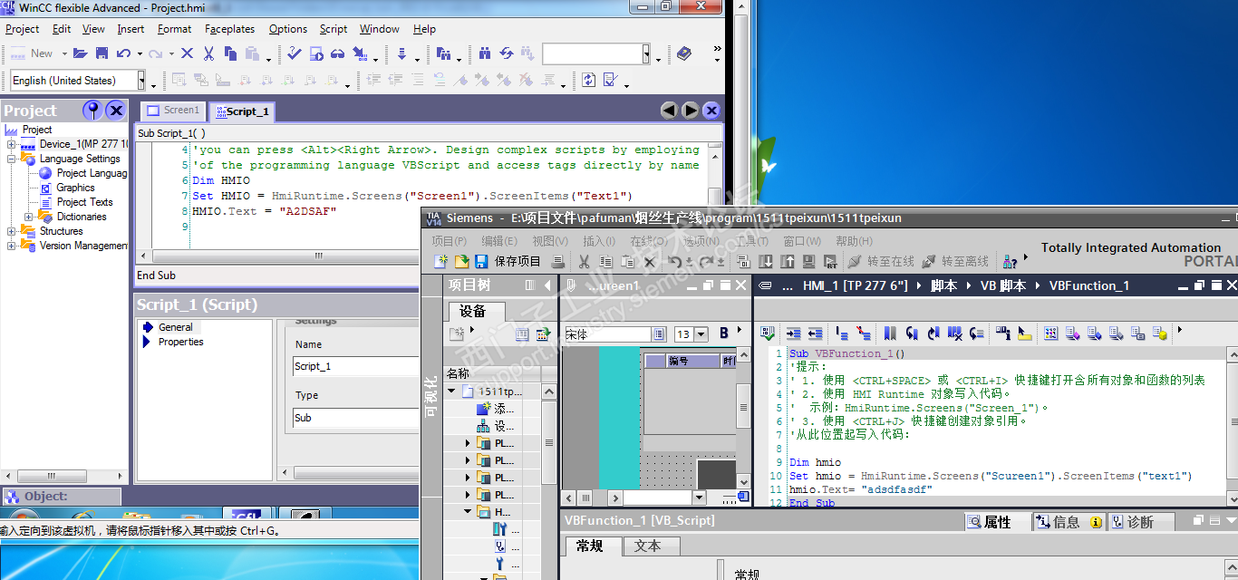 我写了一个脚本程序,分别运行在WINCC FLEXIBLE2008(MP277)和博图(TP277)V14中,但运行结果是MP277正常,但博图中模拟运行时一直报没有Screen1 画面,是脚本不支持还是新的屏与老屏在执行脚本上有区别?如下图