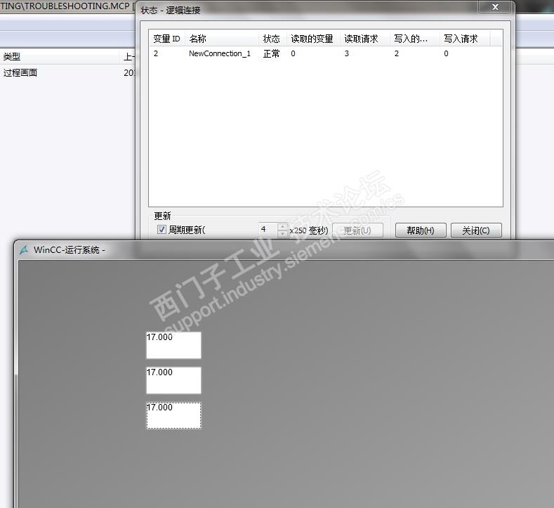 如图,仿照wincc跟我做视频里的那个,建了3个外部变量,然后就看连接状态,发现一直有读取请求,但读取的变量却为0....