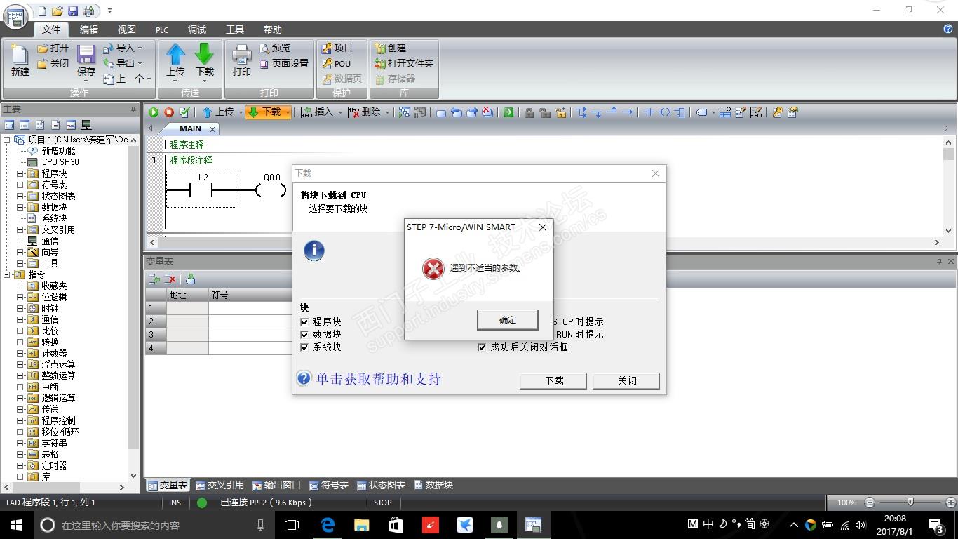 现在是以太网和usb-ppi连接都可以,但是只能下载空程序,只要写一点点逻辑就下载报错,提示如下图:
