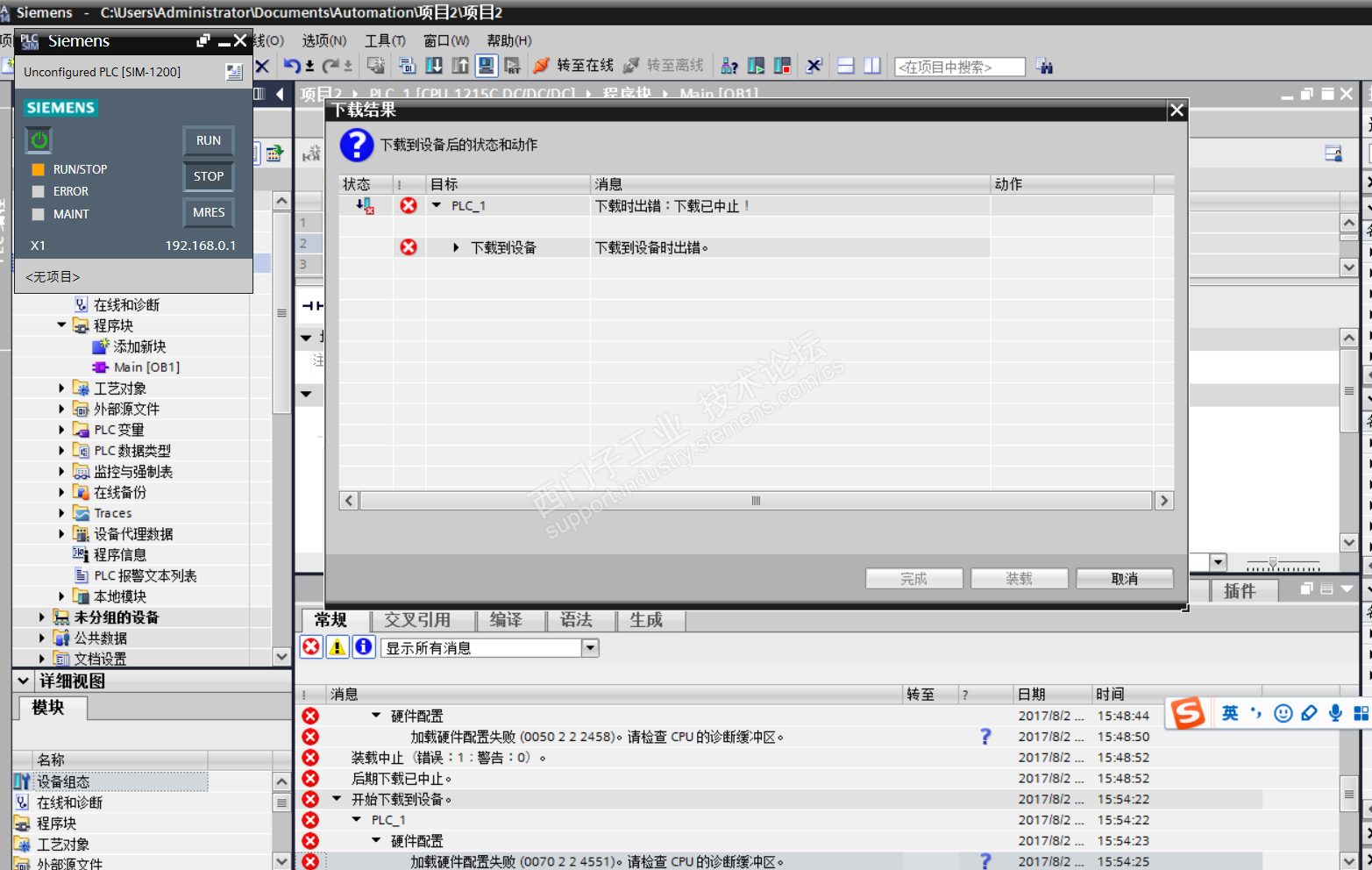 1200系列所有的PLC在仿真下载完成时提示“加载硬件配置失败---”这是什么导致?