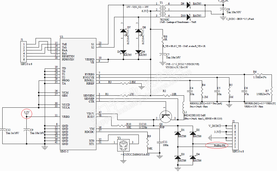 在调试ASIC SIM1-2芯片时,按照规格书上面的推荐电路做出了个PCBA(装配完毕的PCB)。在下图中的Profibus-PA两端给芯片上电DC20V,不工作 -- VREG处无3~5V的电压输出!!!