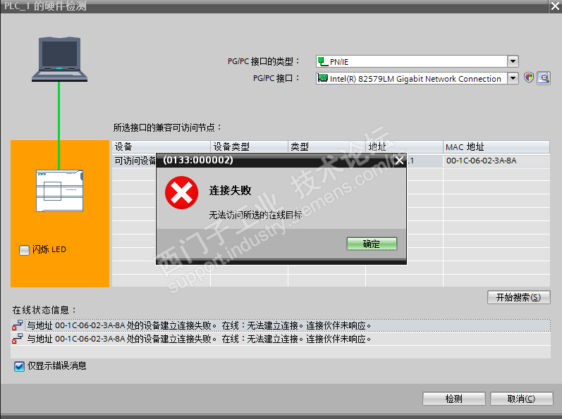 —》点开始搜索 —》找到相应设备的IP和设备类型,还有MAC地址;——》点击检测 ——》 出现错误提示;