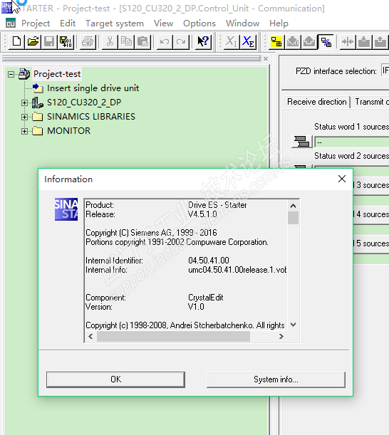 然后添加cu模块,组态报文,参数的调试则用starter。基于博途的startdrive目前只支持g120的调试,s120的cu调试则还需要独立版的starter。但是starter是无法调试SIMOTION的。