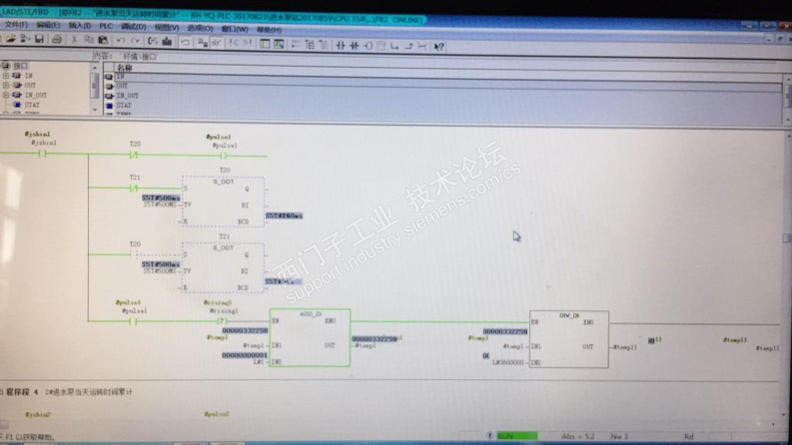 项目要求:进水泵当天累计运行时间,累计按一天时间24小时。累计后不不管运行多长时间,到了今天0点至次日0点,一律清零;附加条件水泵运转达到24小时也一样清零。