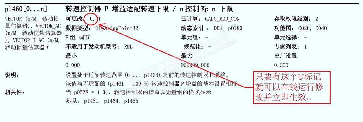 第一,关于能不能在线运行状态修改参数,看这个上图即刻知道了。每一个参数在说明里都会有一个更改条件的标示。只要有“U”字母,就是可以在线运行修改并生效。否则离线修改。
