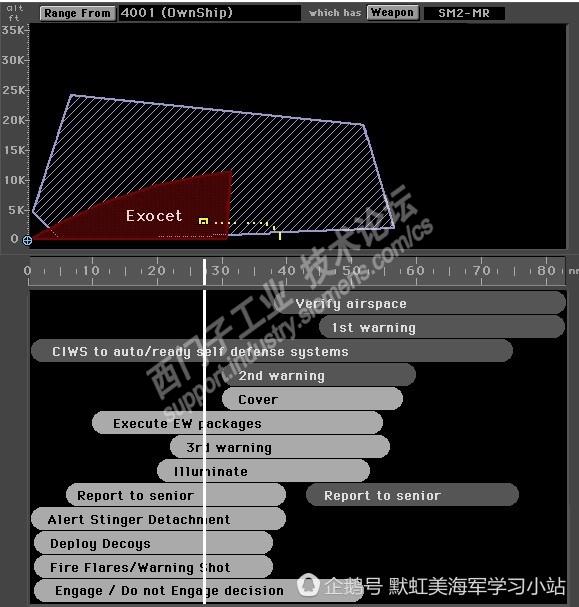 可以看到一根白线贯穿上面的侧视图和下面的甘特图,甘特图的横坐标依然是目标与本舰的距离,而那些条条,就是各种软硬对抗手段了。随着目标距离的接近,梯次采取各种应对,如: