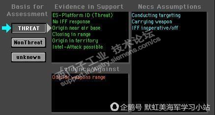 在这里,美军是这么处理的,即在摆出系统自动敌我识别结果的同时,还摆出了判据,而且还是正反判据都有。