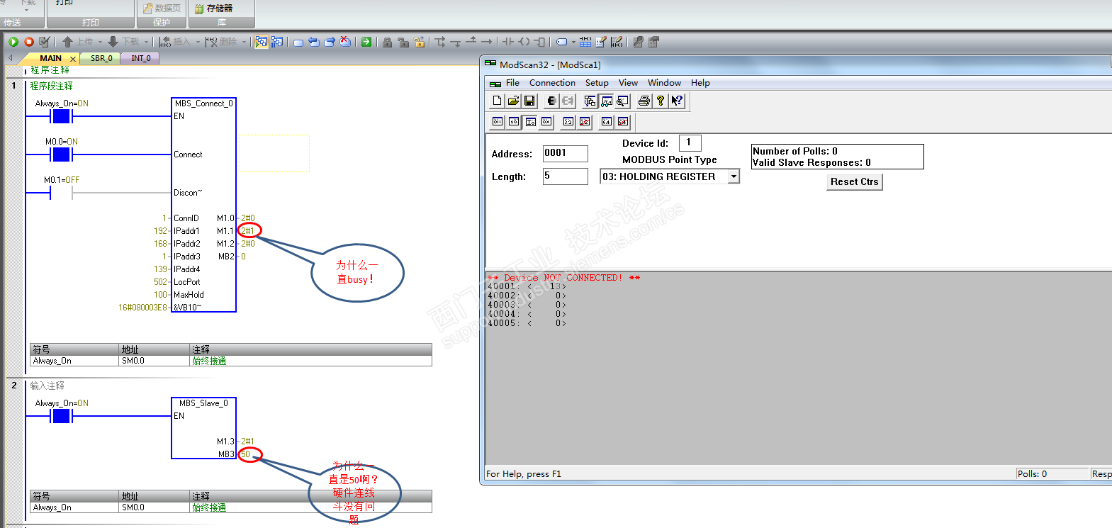smart200 cpu硬件已经升级为2.2。plc做服务器,通过modscan做客户端,修改读取PLC数据,怎么就是通不上,图片如下