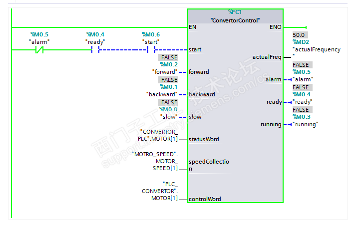 有几十个电机,挂在一张通讯卡上,通过fc1一次性读取变频器反馈的数据,保存到一个db块中,另外通过fc2一次性写入参数,待写的数据放在另以db块中,电机的速度放在第三个db中,通过速度的正反来改变方向的。电机分为正反转,快慢速。下面是控制程序。