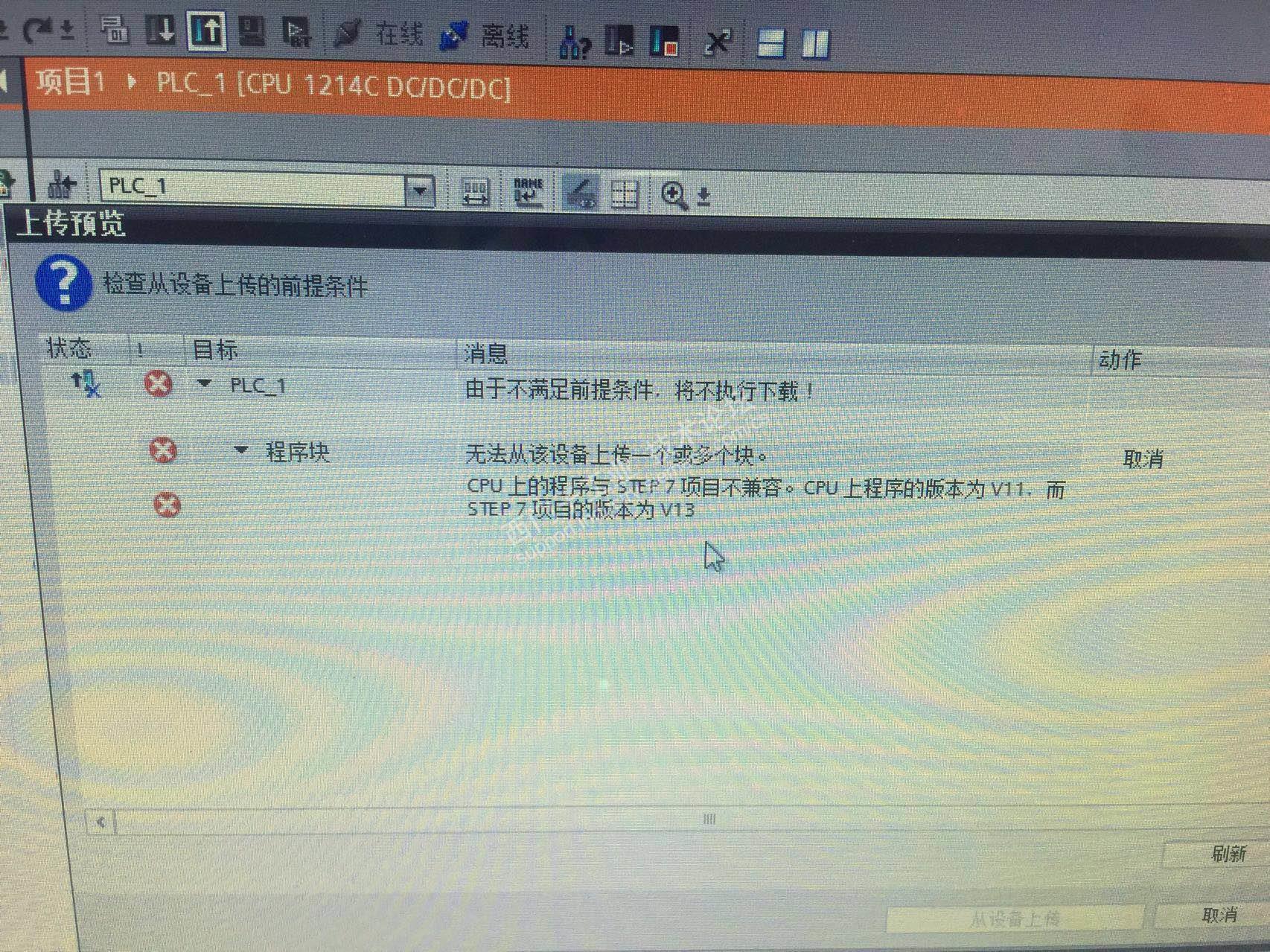 现场有1200PLC,使用V11做的,我用的是V13sp1,导致上传组态失败,没有源程序的情况下,是不是只能把版本降低到V11才能把组态上传上来?有没有什么好方法?