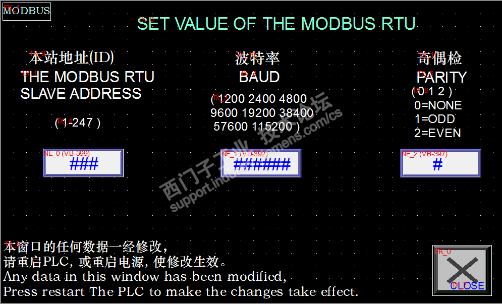 上个图片,这个图片是我们的某个产品的随机触摸屏中在线修改MODBUS RTU参数的设计窗口,图片下面有文字: 本窗口的任何数据一经修改,请重启PLC, 或重启电源, 使修改生效。