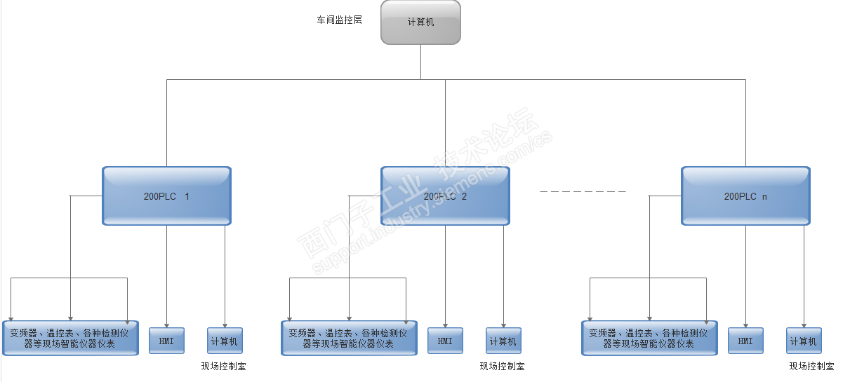 请问下:我要做一套在线检测设备系统并且能在工厂总控制室能读到现场每次检测的数据:每一个检测系统用200PLC控制,我的想法是每个200PLC的通信有:1:与现场的设备通信比如变频器,温控表,还有各种检测仪(厚度检测仪,金属检测仪,化学成分检测仪等等)2:HMI用于操作员现场的操作检测3:现场的控制室内的计算机通信用于数据采集处理和打印4:与其他PLC组成网络并把数据传输到工厂总厂的控制室的电脑上,用于领导观察数据分析现场情况。如下图所示