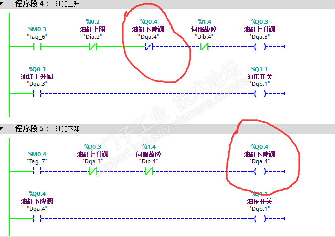 这个是程序扫描顺序的问题,还是仿真软件的问题呢?常闭触点Q0.4怎么就不通?前后程序都再次执行过,还是不通?无法互锁。