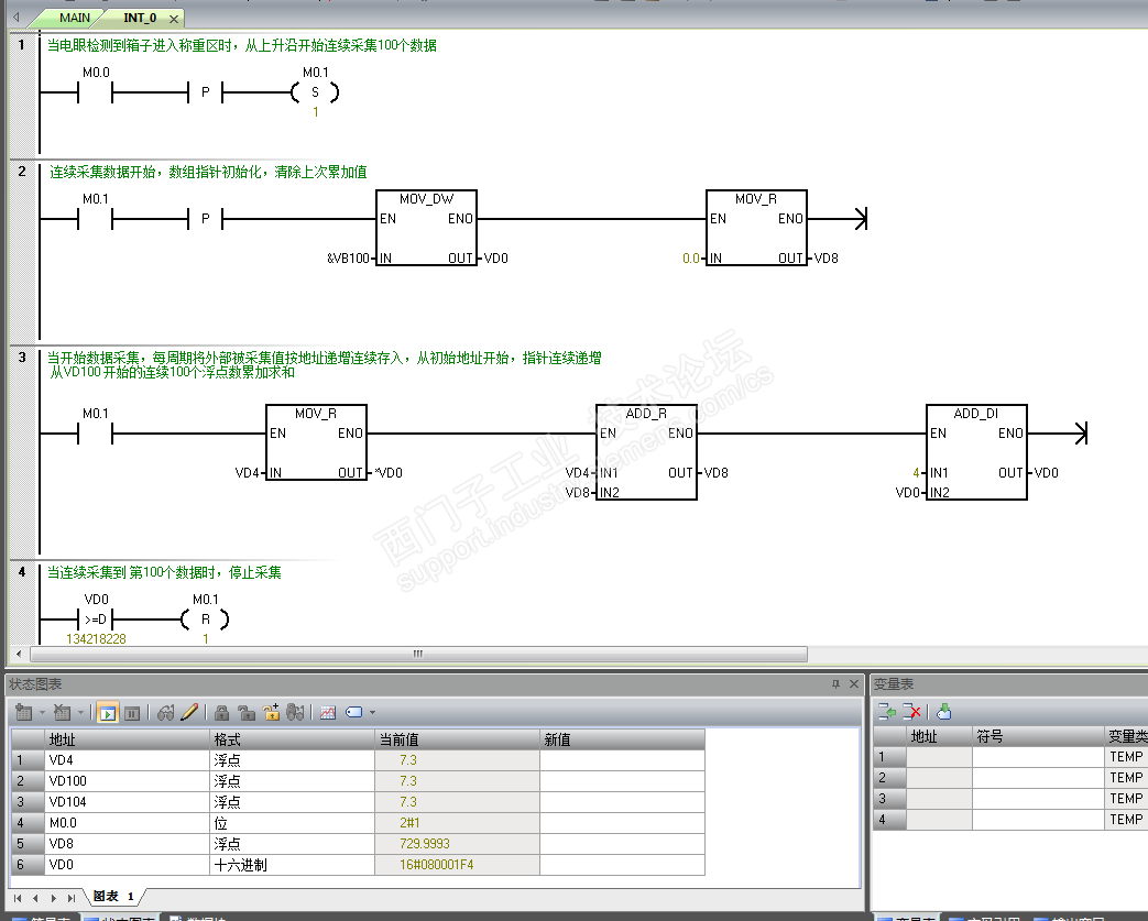 另外,逻辑上我更改了一下,当外部信号M0.0(可以当做I0.0)触发时,连续采集100个数据到缓冲区,并累加求和: