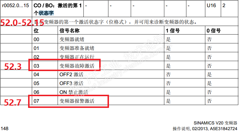52.0到52.15,一共16位字,每一位的含义都在状态字里介绍。