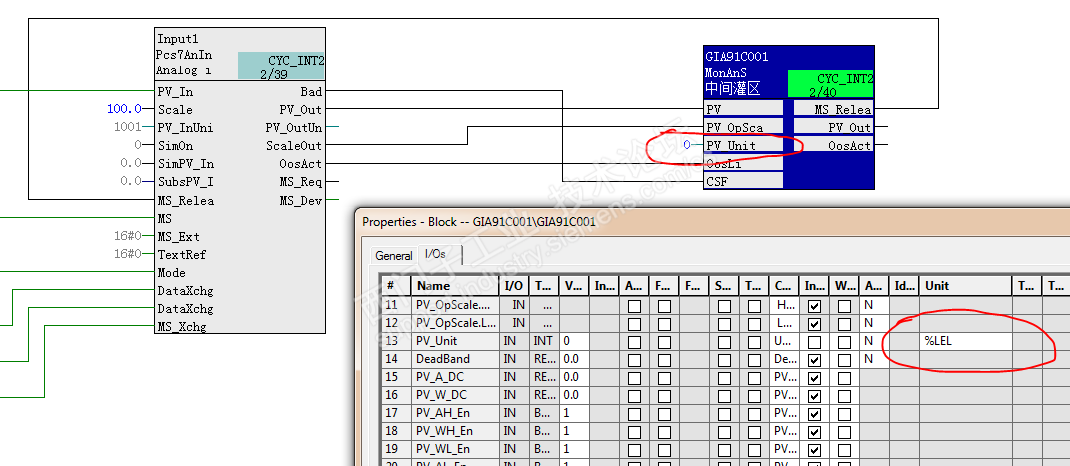 方法是不要将AI通道块的PV_OutUnit连接到显示块的PV_Unit上。将显示块的PV_Unit的值设为0,在显示块的IO属性里的Unit列,给PV_Unit自己输入%LEL即可。如下图: