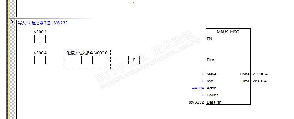 smart 200 PLC做主站,温控器做从站。现在温控器周期T不要每个扫描周期都去写,这个周期T只需要我修改后写入一次或者几分钟之内不停写入也可以接受。我写了以下程序,V600.0是触摸屏上的写入开关,这样后面的Done V1900.4能置位1吗?因为我下面的还要用V1900.4触发轮询,大师们看看我的程序正确吗?