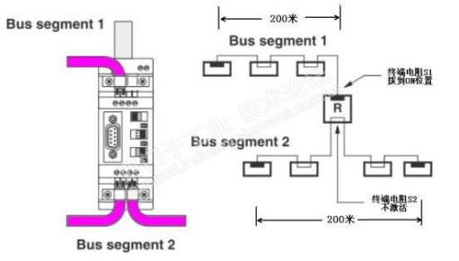 当主从站数量超过32个或者通讯距离过长时,需要在DP线路上增加中继器。