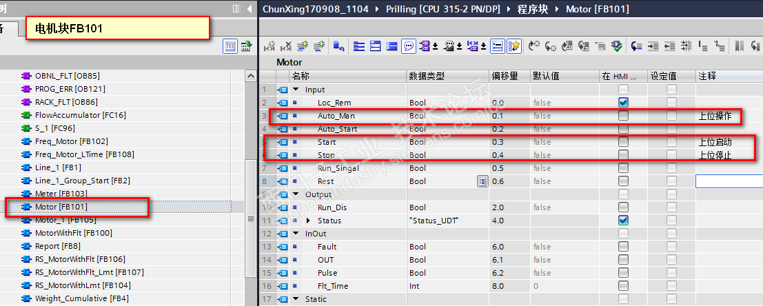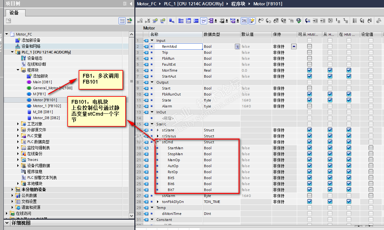 方法二:建立电机块FB101(上位手动控制信号声明为Static类型),建立调用多个电机块的FB1,如图