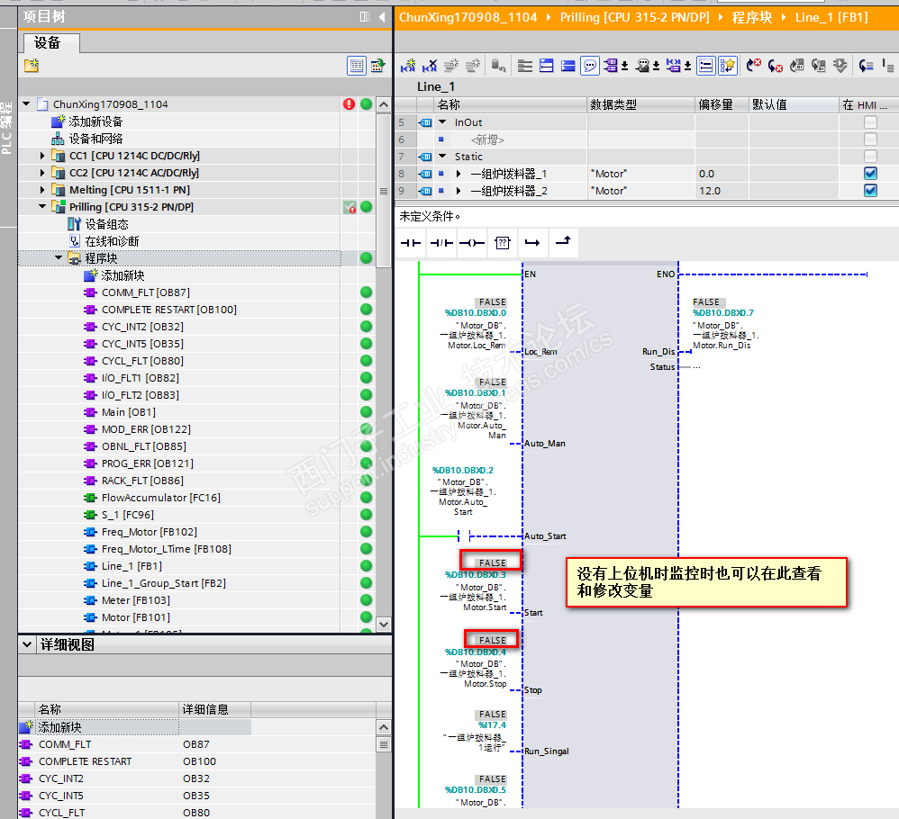 2.FB1监控时看不到上位机的控制信号,在PLC程序里想查看电机的启停控制信号需要在DB1里查看,修改需要在监控表里实现