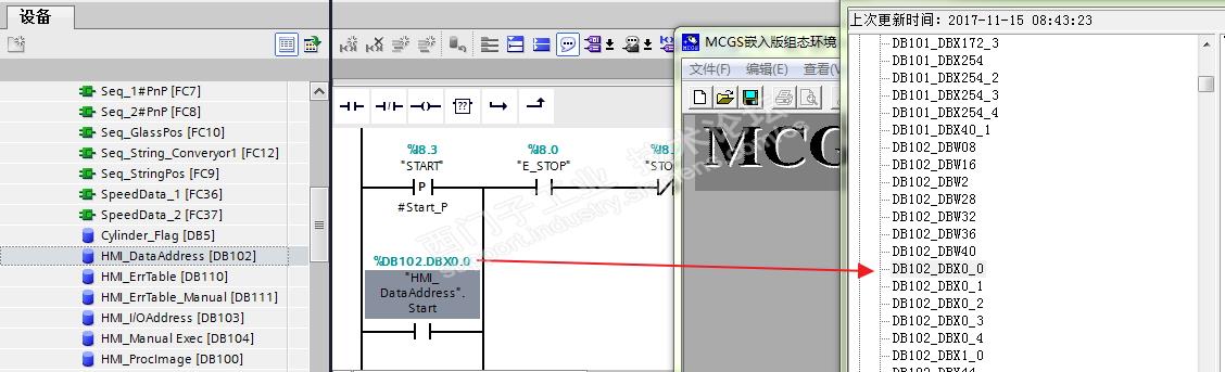 比如s7-1200里有个HMI_DataAddress数据库,里面有个变量start(是常开符号,只有一个交叉引用),其地址是DB102.DBX0.0,在昆仑通态的设备窗口里居然没有,这是造成了我的困扰,以为自己的路子走错了、以前想错了。几经周折,后来在它的菜单的“对象使用浏览”里找到了,于是放下了自己的疑虑。如下图红箭头所示。