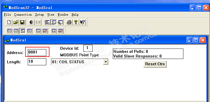 今天又重新做这个工作,首先由通讯电缆上载程序,发现上载程序没有问题,说明问题不在线路上,然后开始用ModScan进行数据读取操作,设置如下: