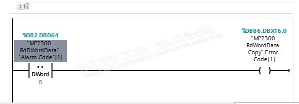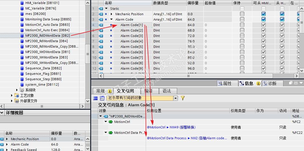 比如下面这三张图里,有个数据块叫MP2300_RdDwordData[DB2],它有个变量叫Alarm Code[1](如图1)。