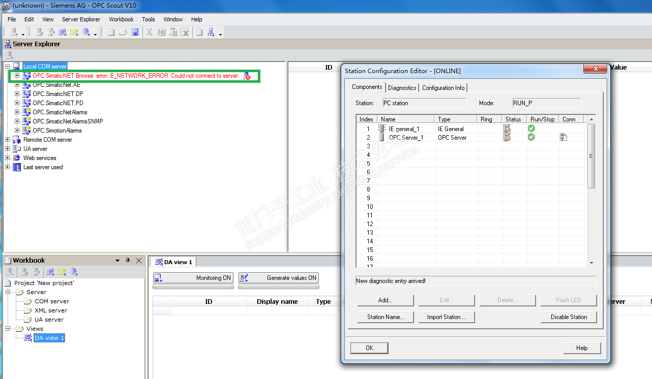 OPC Scout V10连接不上OPC服务器,昨天还行,今天发现不行,然后重新下载PC station进去也不行,有大神最大的吗?求教!(下图绿色标记了问题所在之处)