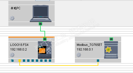 3. 从Modbus设备的端口拉到LOGO的端口,建立连接,图中黄色的线;