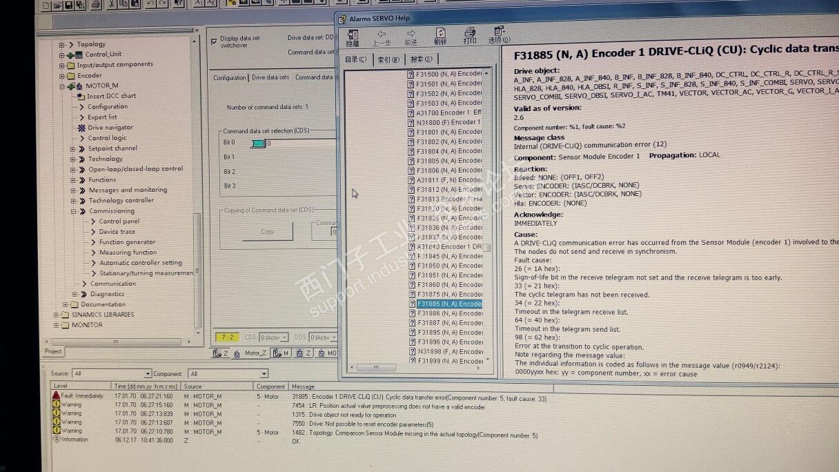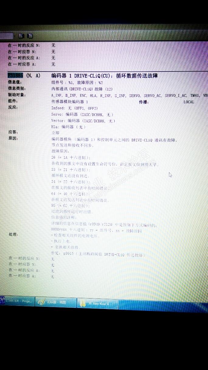 有一台,1fk7,的伺服电机,正常运行,突然,报f31885故障 故障原因,代码,是33,,16进制是21。查询相关资料,图片附上。