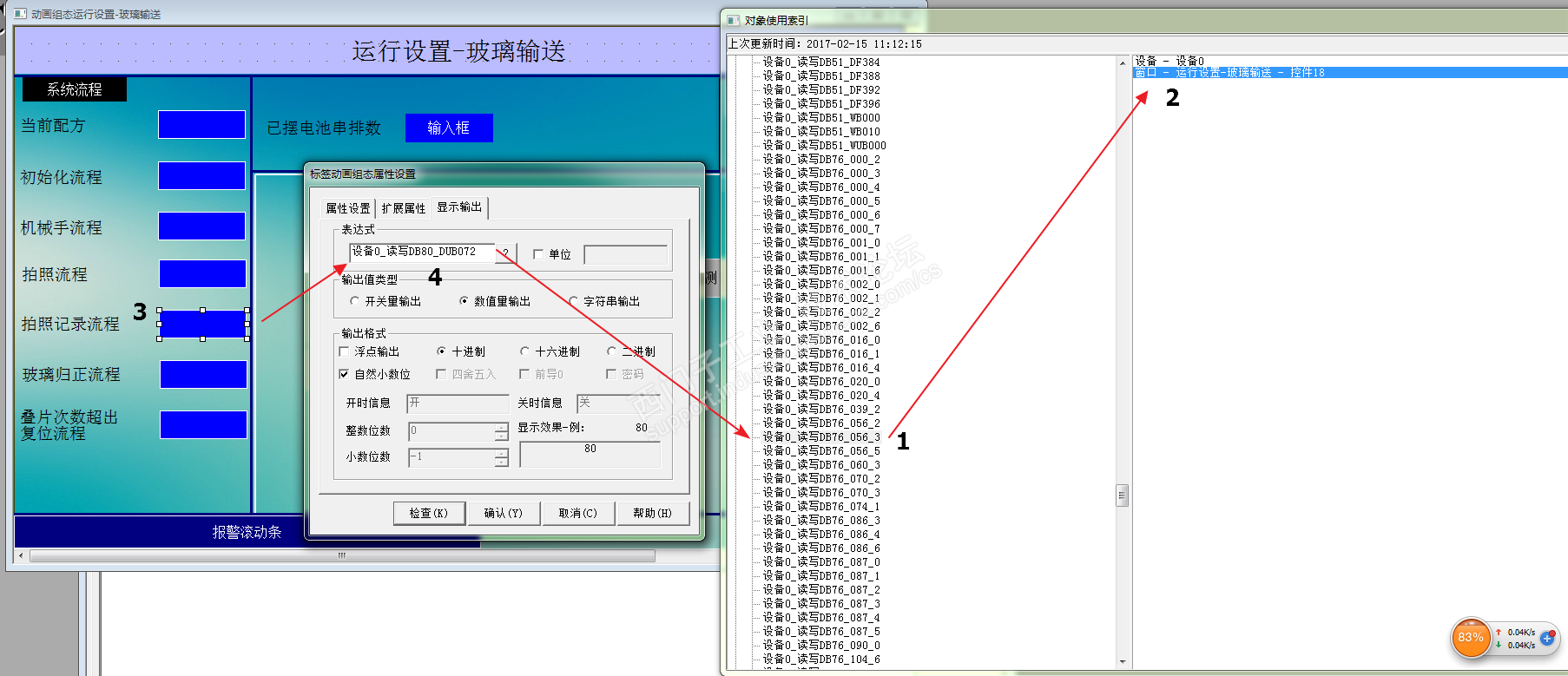 我公司的PLC是s7-1200,但是面板软件是昆仑通态软件,我在此软件的“对像使用索引”菜单找到“设备0_读写DB76_056_3”(步骤1),然后点击右栏的控件(步骤2),显示出其对应的窗口“拍照流程记录”(步骤3),打开它的属性,却见它的表达式是DB80_DUB72。二者不一样。