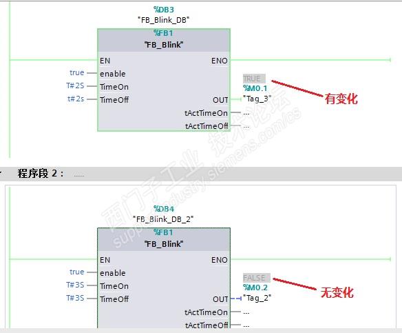 如题,当我创建了一个FB_Blink的FB功能块后,在OB块里重复调用时,却发现只有第一次调用的FB_Blink起作用,而另一个却没反应。