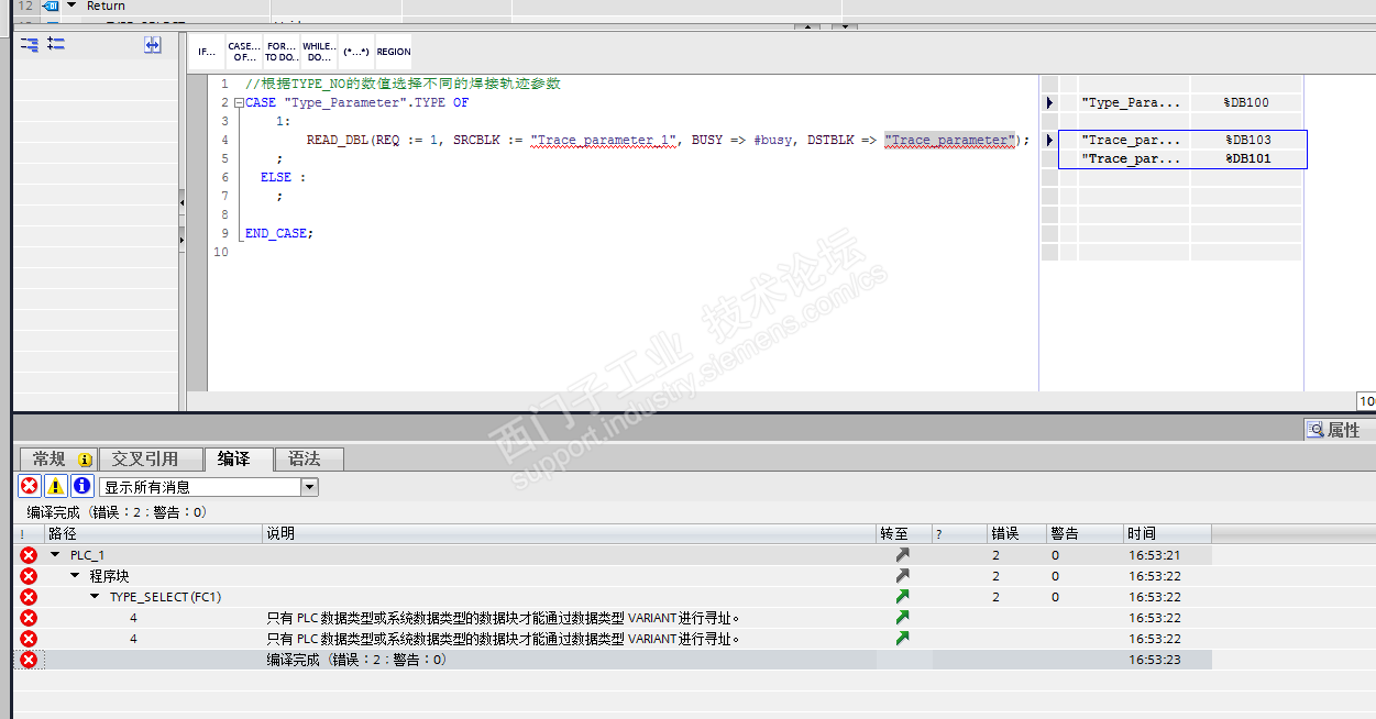 我需要保持的参数比较多,我建立几个db块,设置只存储在装载内存中,然后再建立一个db在工作内存中,然后根据不同的工况将装载内存中的db复制到工作内存的db中,报错。