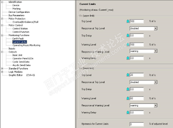 I>报警电流可设在95-110之间,我们一些重要设备设在95%,因为一般电机的选型都是在额定电流的80-90%之间,超过95%长期运行,发热就严重了,我们这样设置更多是为了提醒操作人员1,电流95%以上报警,可以调整工艺参数(比如阀门等)使电流降下来。
