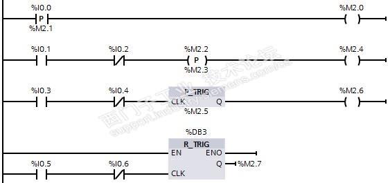 R_TRIG指令与P_TRIG指令都是用于检测流入它们的CLK端的能流的上升沿,并用Q端直接输出检测结果。其区别在于R_TRIG是函数块,用它的背景数据块DB3保存上一次扫描循环CLK端信号的状态,而P_TRIG指令用边沿存储位M2.5来保存它。P 触点和P线圈分别用边沿存储位M2.1和M2.3来保存它们的输入信号的状态。
