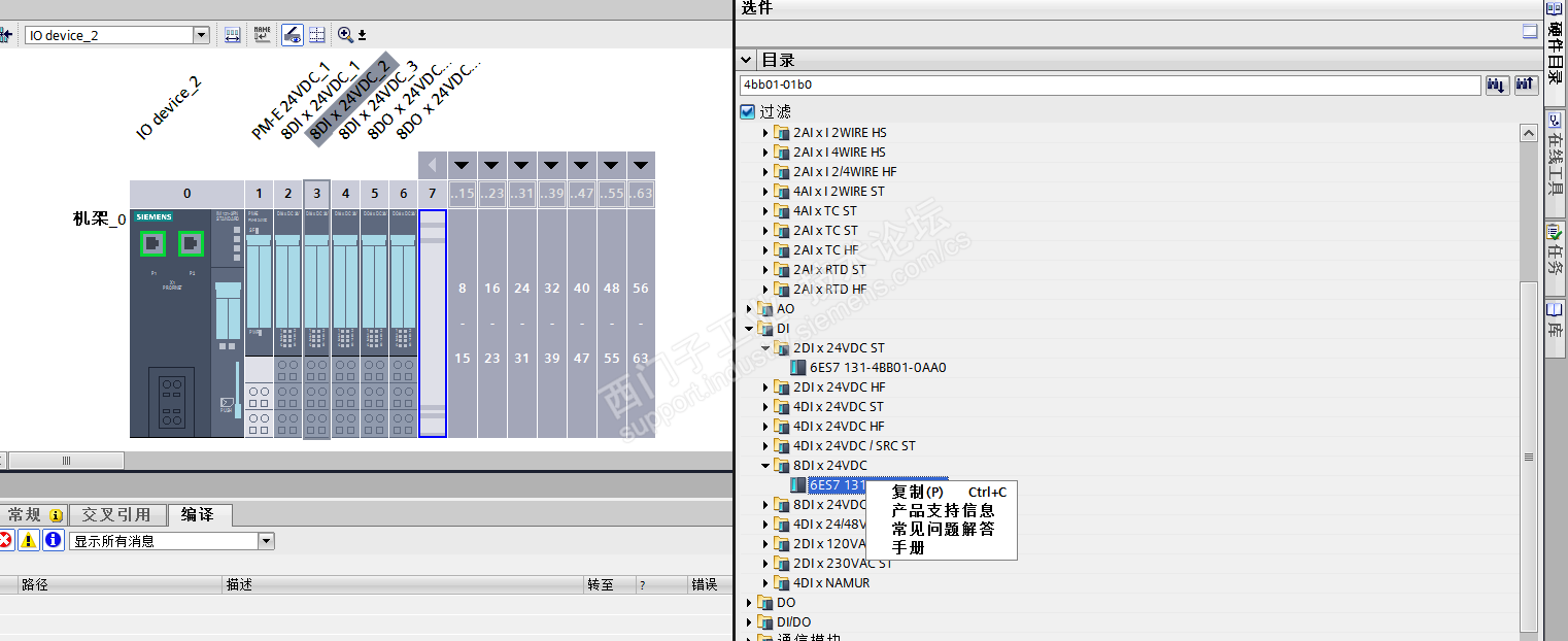 打开-博图项目,展开-设备视图,点击相应的硬件模块,点击-硬件目录,勾选-过滤(如果不过滤,显示的是所有的硬件),展开硬件至最底层显示订货号,右键,选择需要的信息,经常用到的就是-手册了,点击后会跳转到下载中心,需要的手册就静静的躺在这里了!