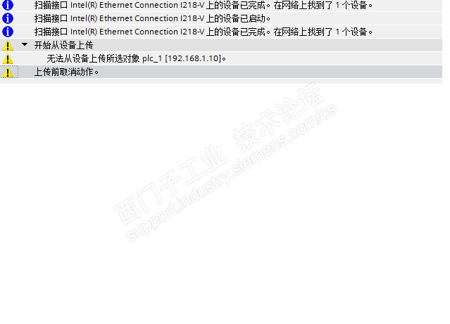 按照西门子官网上的S7-1200程序上传到PC端的步骤进行操作,已搜索到相应PLC地址,并且点击“从设备上传”,但是出现“上传前取消动作”,是什么原因?用的是TIA V14版本