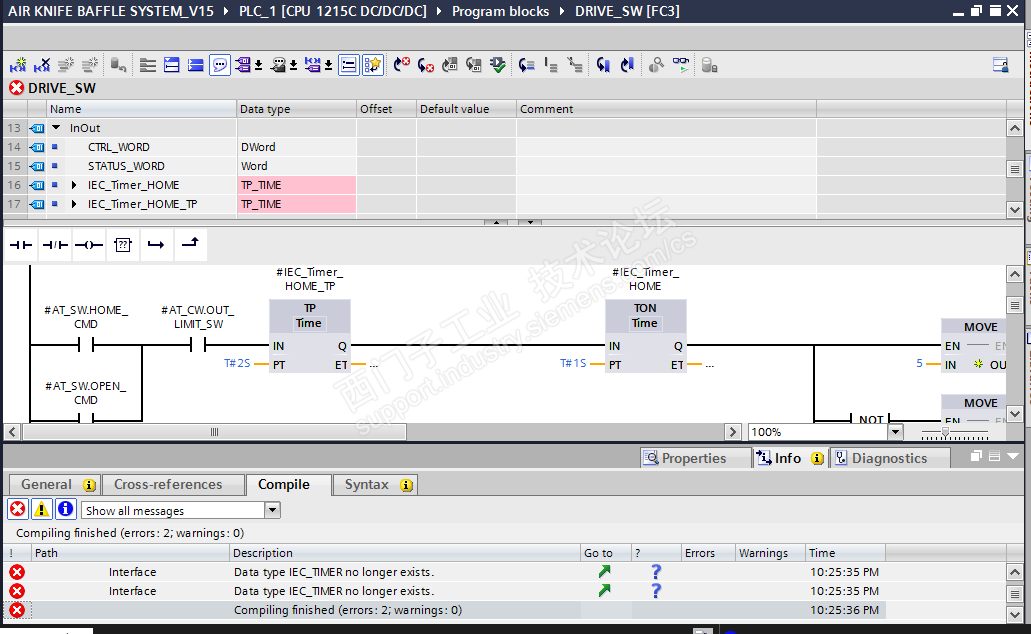 1. 发现FC块中,作为参数的定时器,编译不能通过(单独对此块进行编译),报定时器不存在,难道是升级V15时,程序出问题了,再回到V14,进行块编译,没有问题。