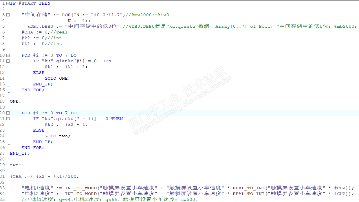 下面是我的一小段SCL程序理论上是否可以通过改变小车两个电机的速度差来完成轨迹校正?