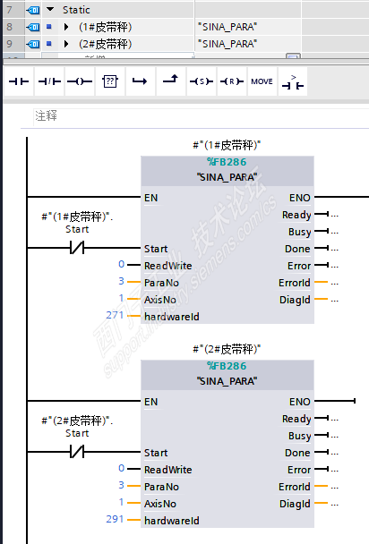 好,我知道了。程序这样写不知道行不?这个FB放在OB30里,OB30中断时间250ms,让CPU每隔500ms读取一下6台变频器。读取每台变频器的状态字1、转速、电流。