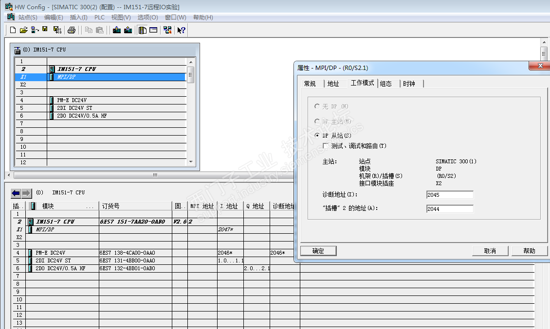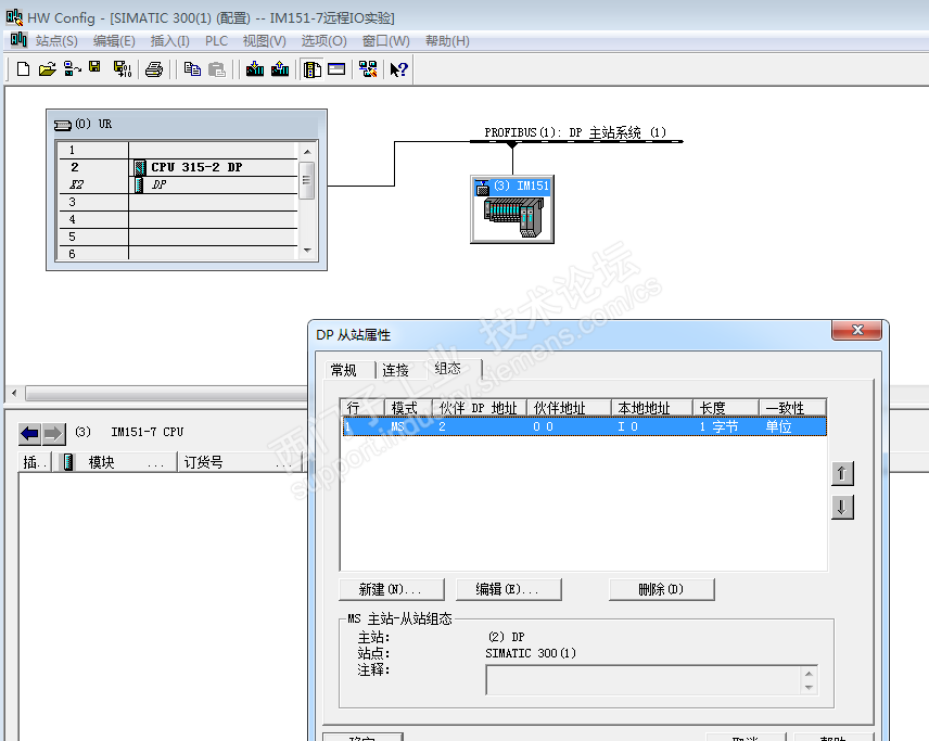 大家看,手里有315-2AG10的2DP CPU,还有一个远程IO从站模块IM151-7 CPU,打算练习一下远程IO的学习和组态,在远程IO上插了一个电源模块,一个2DI,一个2DO。软件试着组态了一下,下载进去后主站BF闪,从站STOP亮,SF亮。怎么回事呢?硬件组态错了?还是从站模块插错了,怎么回事呢,网上找这个IM151-7的资料也太少,怎么才能和这个从站连起来呢?前辈指点一下