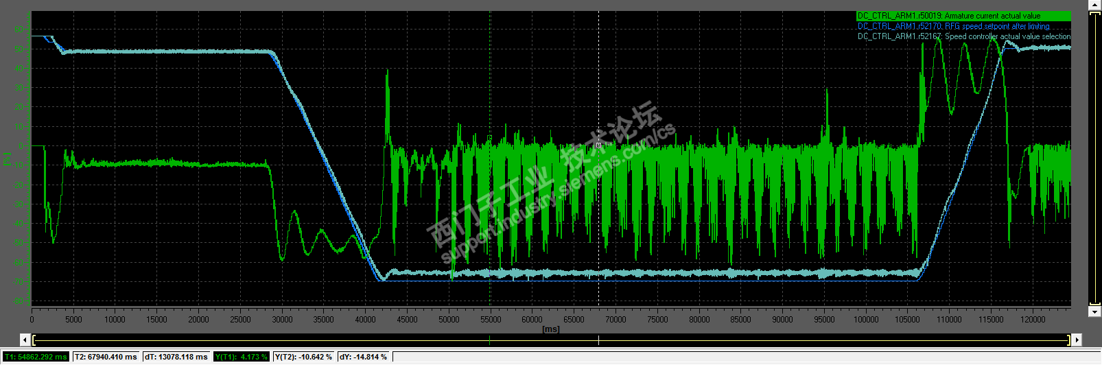 以下是副井一个方向的TRACE图,轻载(蓝色给定/绿色电流/青色速度)