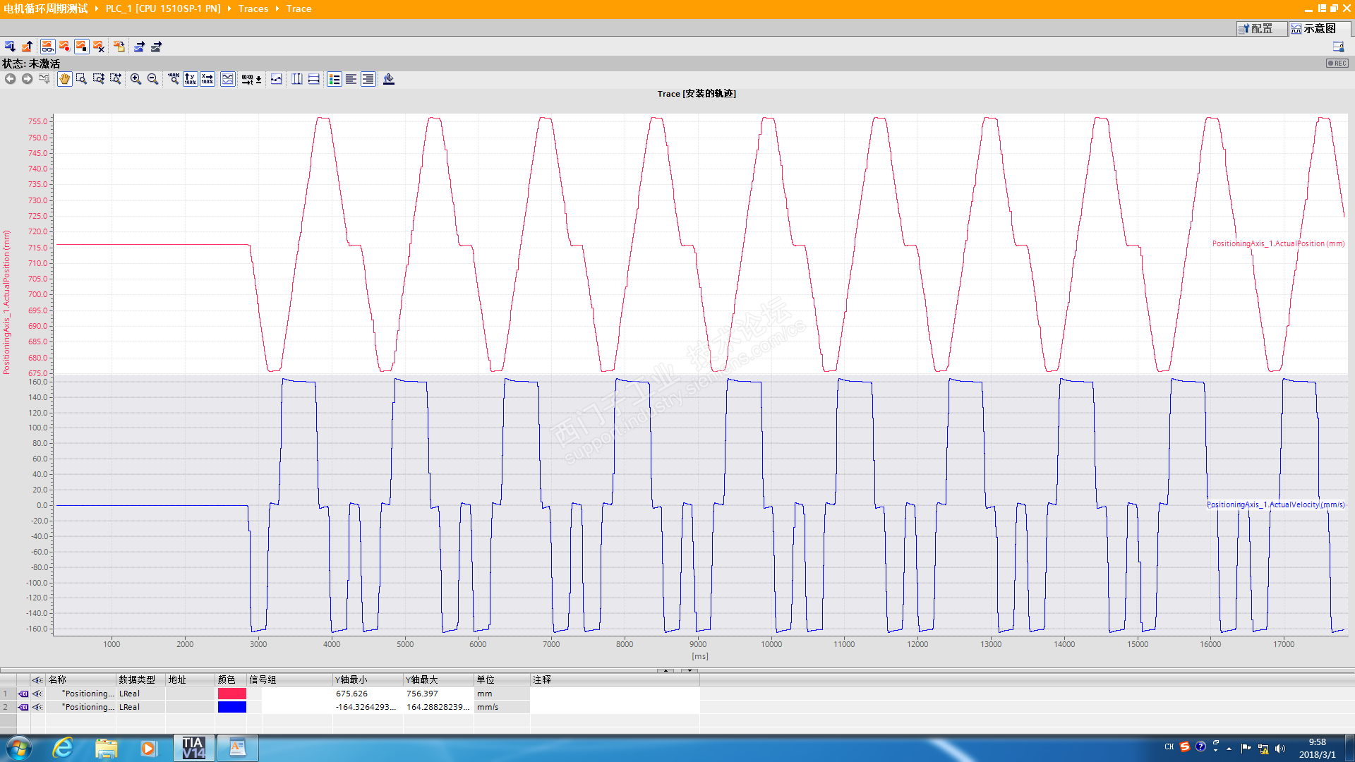 本人新手上路,项目比较急,提前做仿真,等电机变频器到货,以前没怎么摸过plc。我用PLC在线仿真,变频驱动器为s120,让直线轴周期的振动(振幅±40,周期为1秒,理论上速度160mm/s就可以完成,哪怕多10%延迟也是接受的,这个直接延迟了50%以上),但是延迟比预期大得多,是否需要更改哪些参数,不断改变扫描时间和组态加速度都减小不了延迟,只有速度改成2倍才减小延迟,还是不能在一个周期完成,还是说在线监视,增加了cpu的扫描时间,等到有变频器和电机到了,这个延迟就减少了。