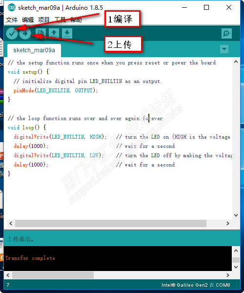 下面是操作流程,并且编辑一个Arduino通用测试程序LED闪烁。