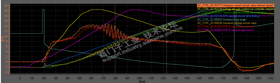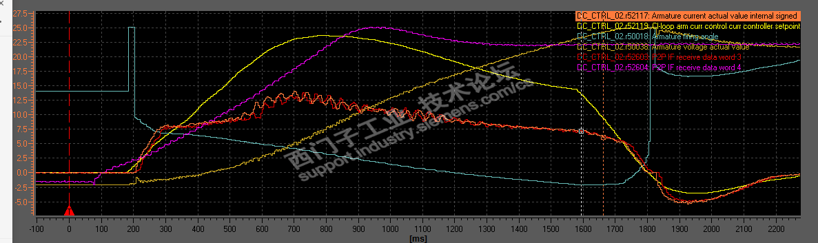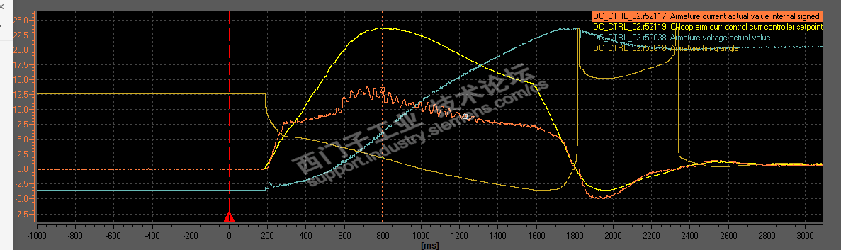 上图为12相主装置。在轧钢时电流急剧震荡,此曲线为空载启动并且调小电流环P值的时候录的。在电流超过装置电流10%的时候就开始震荡了。 此时@角输出并未见波动。52603是从装置传过来的电流。