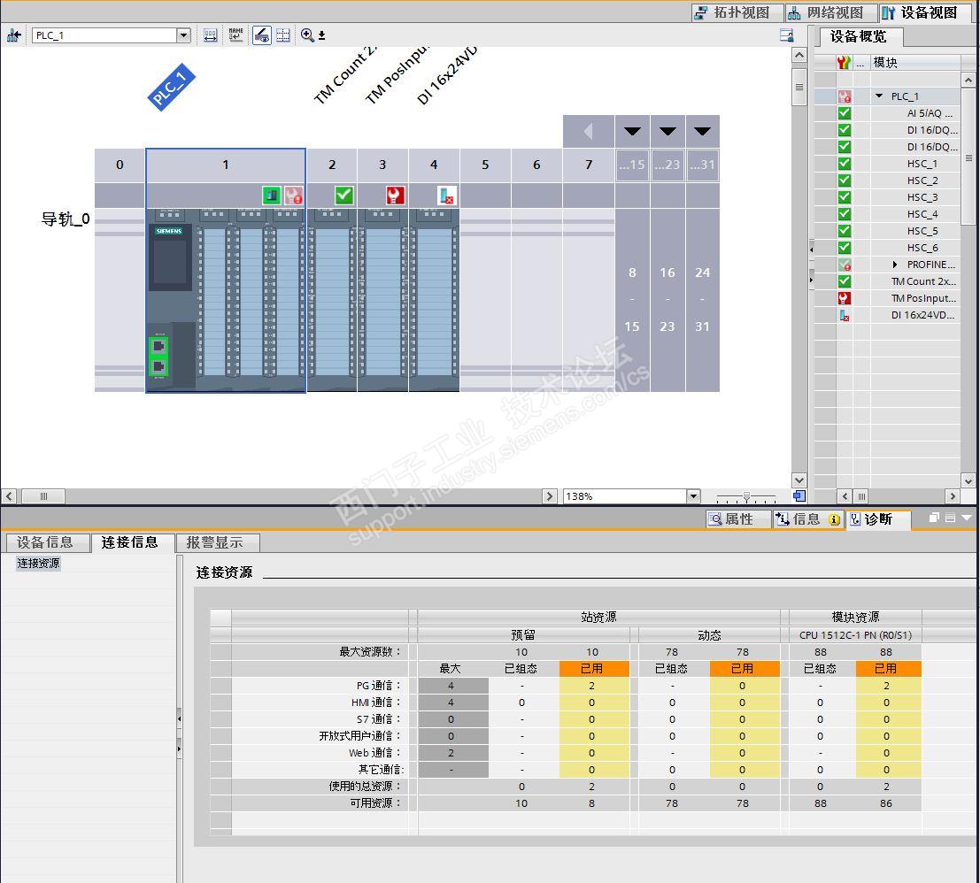 可以在"网路视图"中选择在线连接的CPU,并在巡视窗口中选择"诊断"——-〉"连接信息"选项卡,查看已经使用的连接资源。